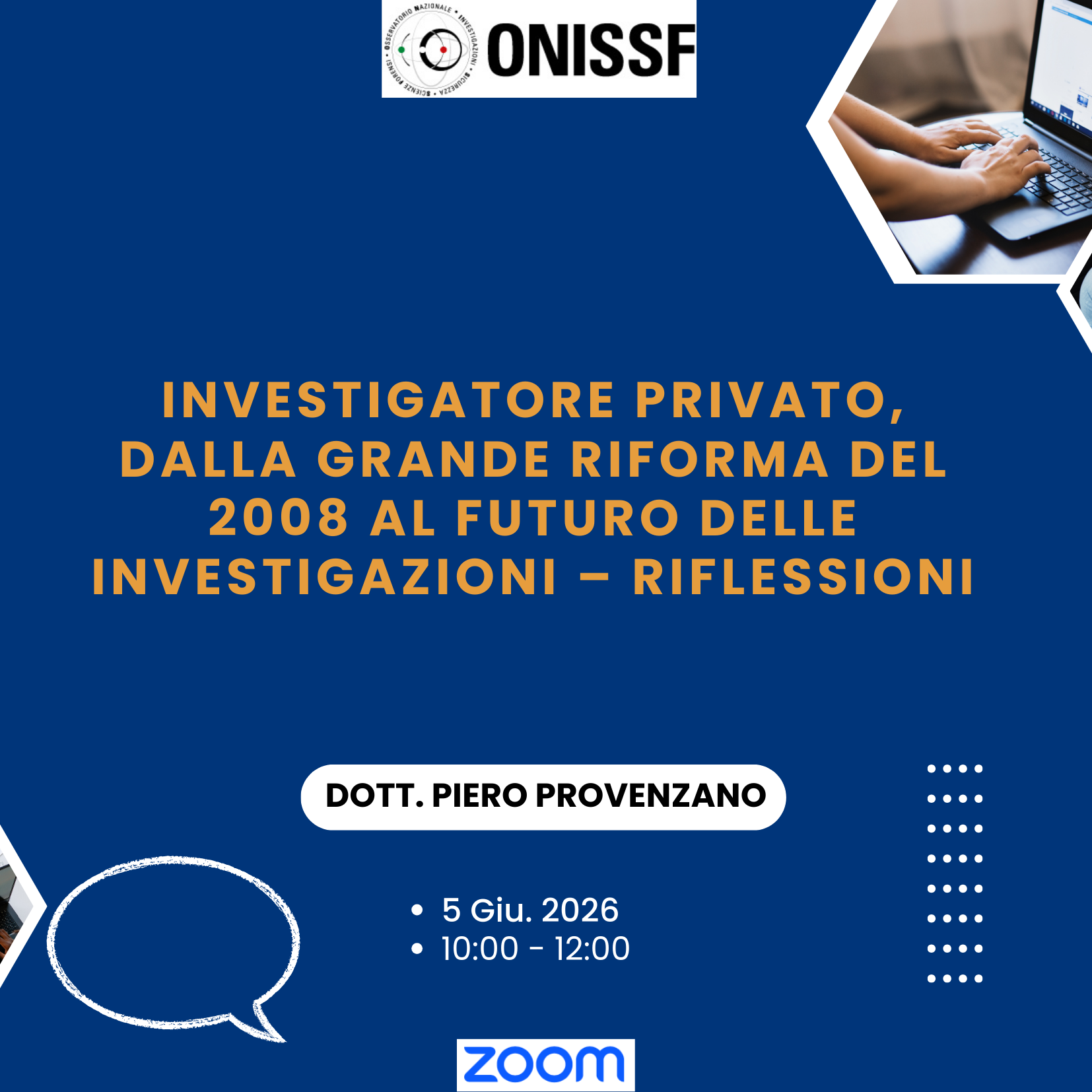 Investigatore Privato, dalla grande riforma del 2008 al futuro delle investigazioni – RIFLESSIONI con il Dott. Piero Provenzano – 5 Giu. 2026 – Ore 10.00